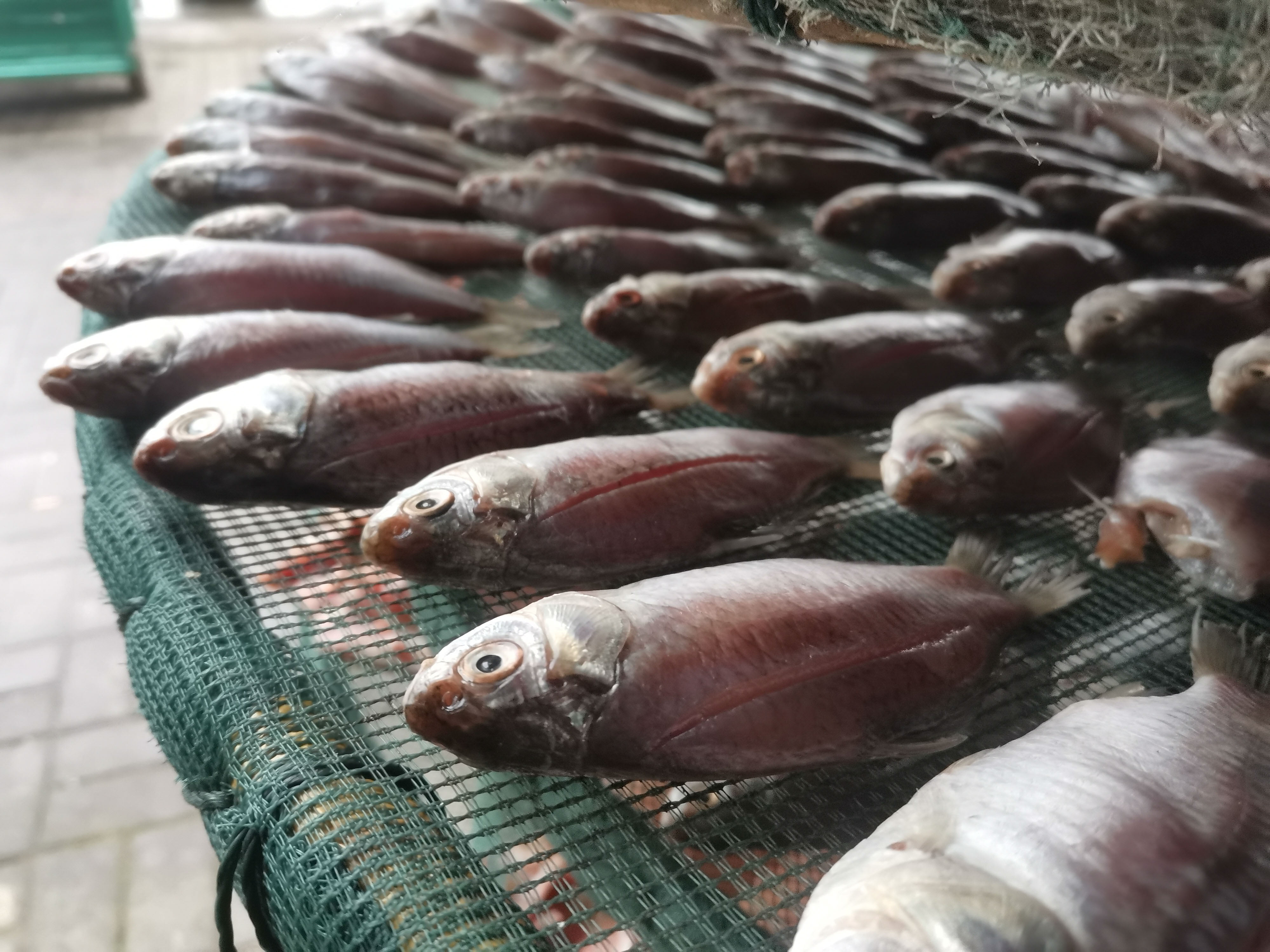 ↑ 岳阳县六门闸渔户摆盘准备晾晒的鱼